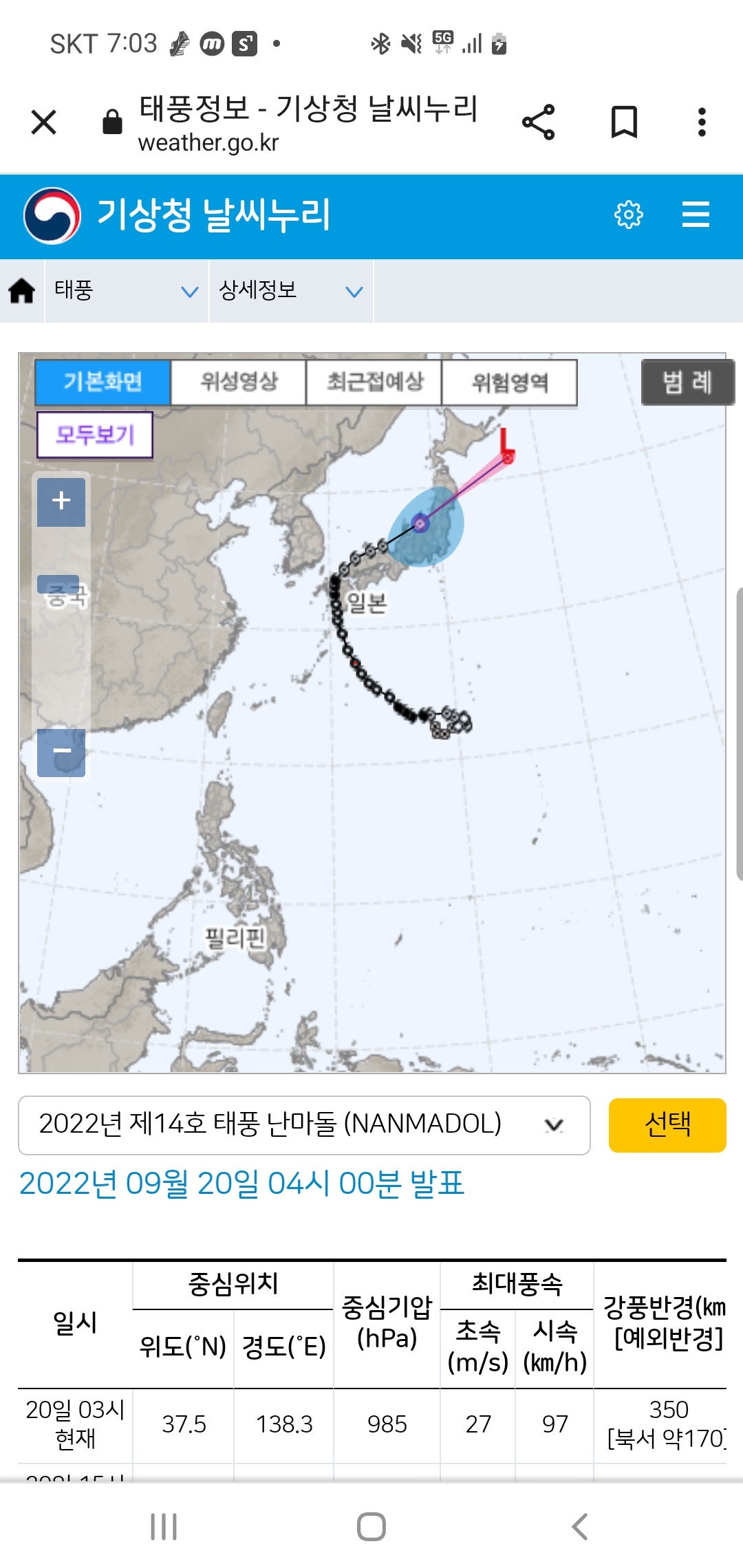 태풍경로 난마돌의 어제 위치입니다. 태풍정보는 기상청 날씨누리 출처입니다. 난마돌은 어제 오전에 우리나라에 접근했다가 벗어났습니다.
