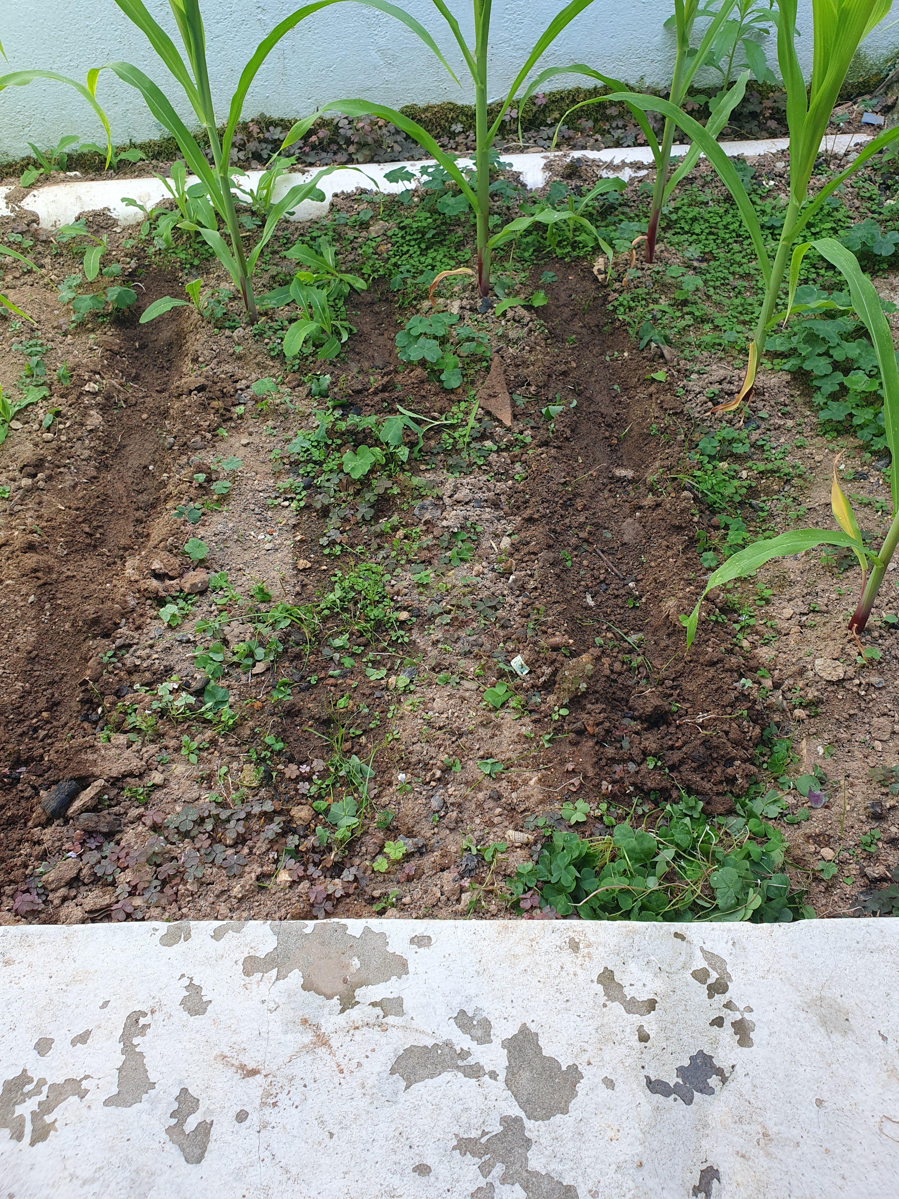 며칠 전에 쿠팡에서 요소 비료를 주문했는데 아직 오지 않아서 미리 비료 넣을 골을 파 놓았습니다. 밭에 일부 심어 놓았던 상추와 파는 남편이 정리하라고 해서 이번 참에 정리를 했습니다.