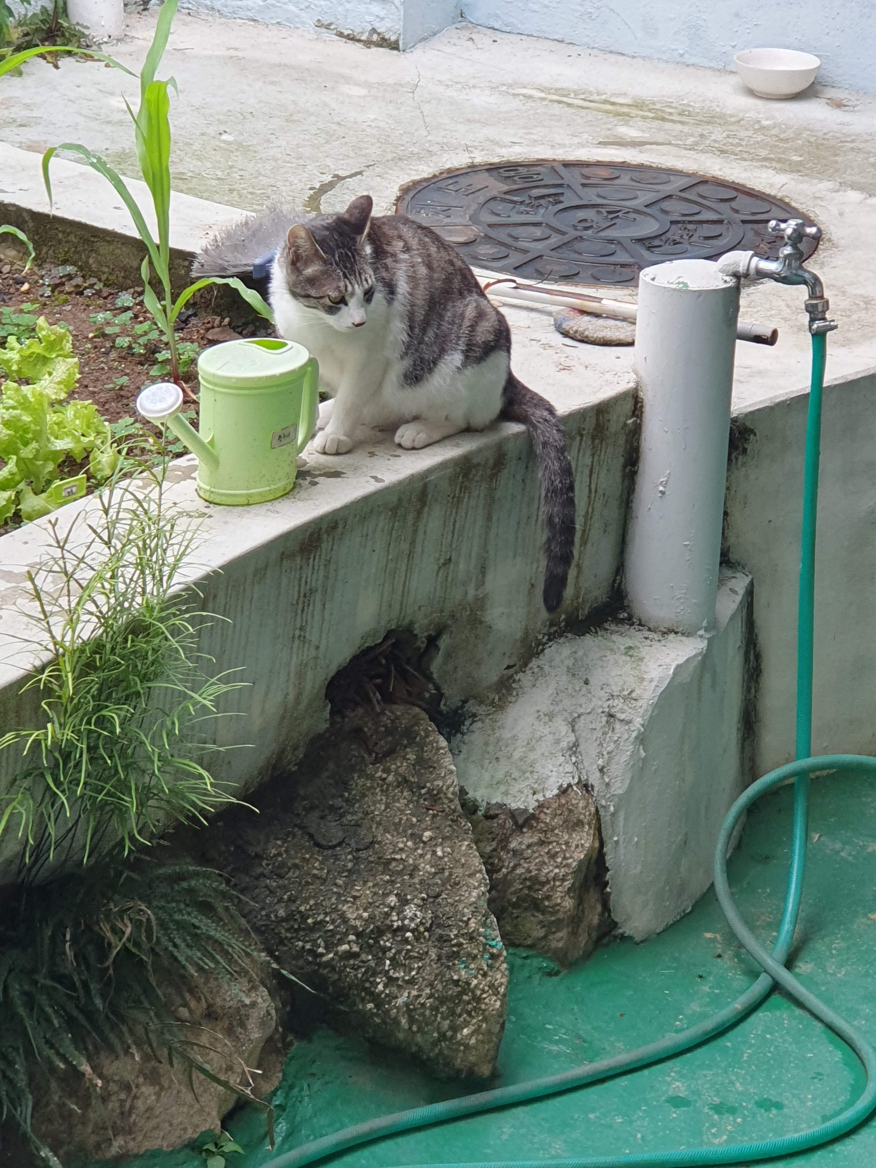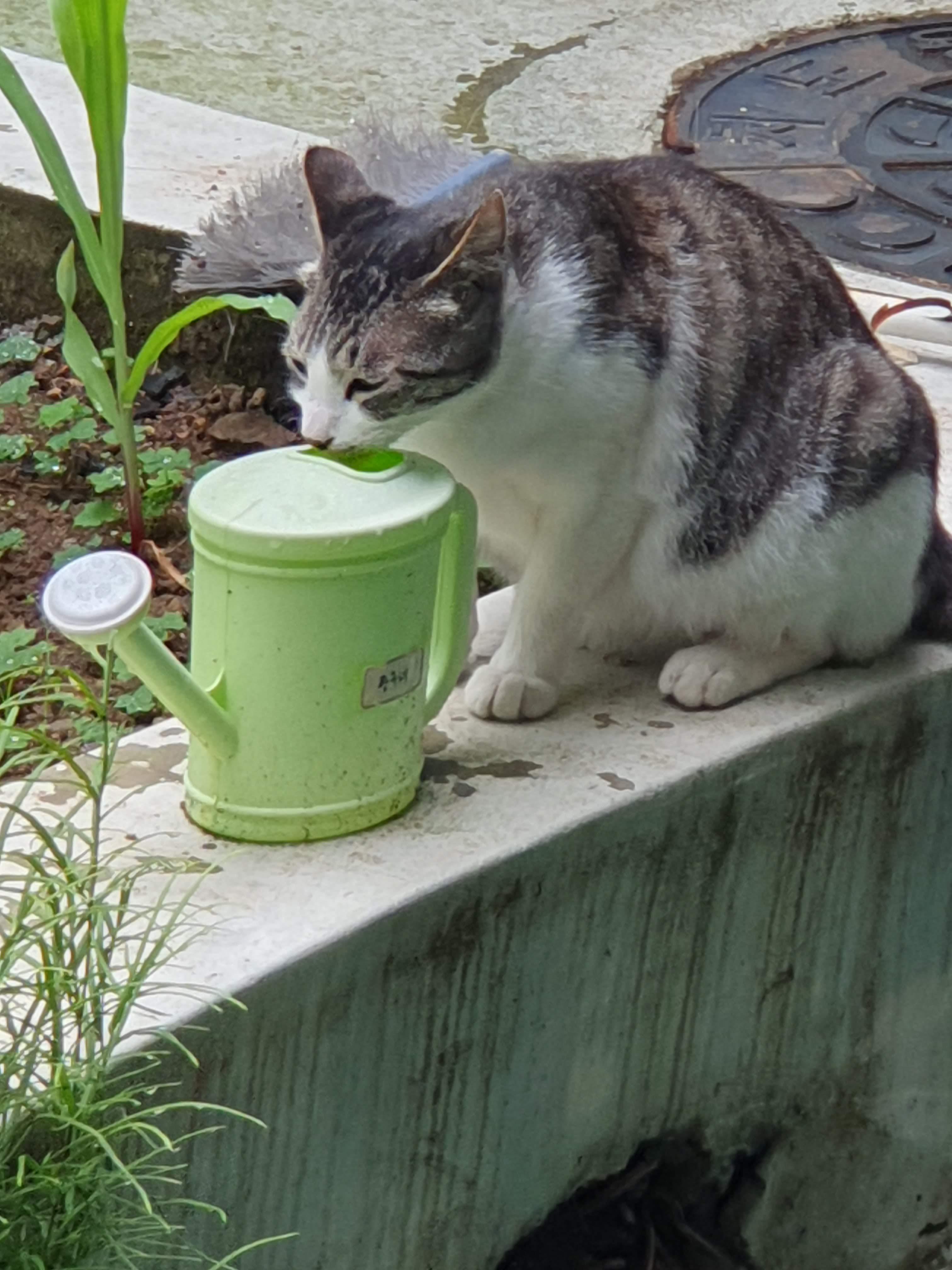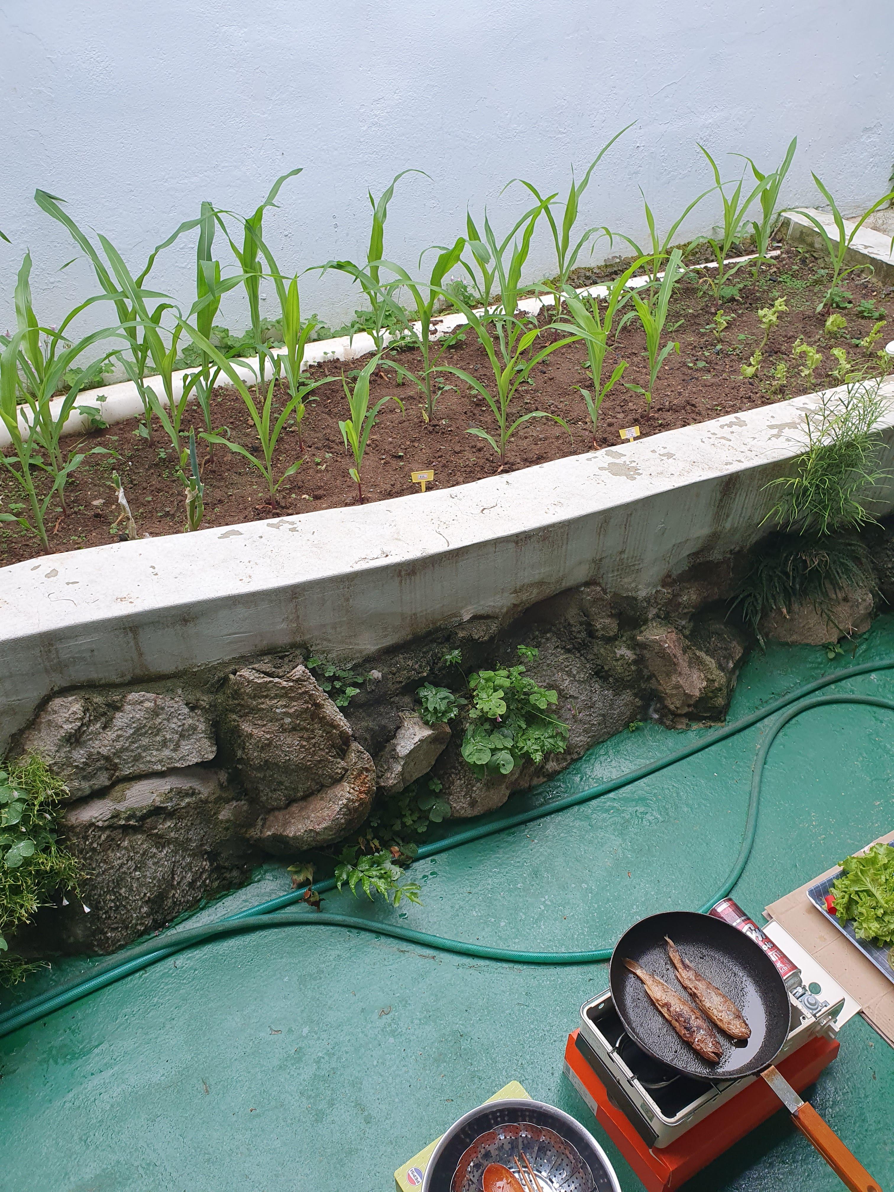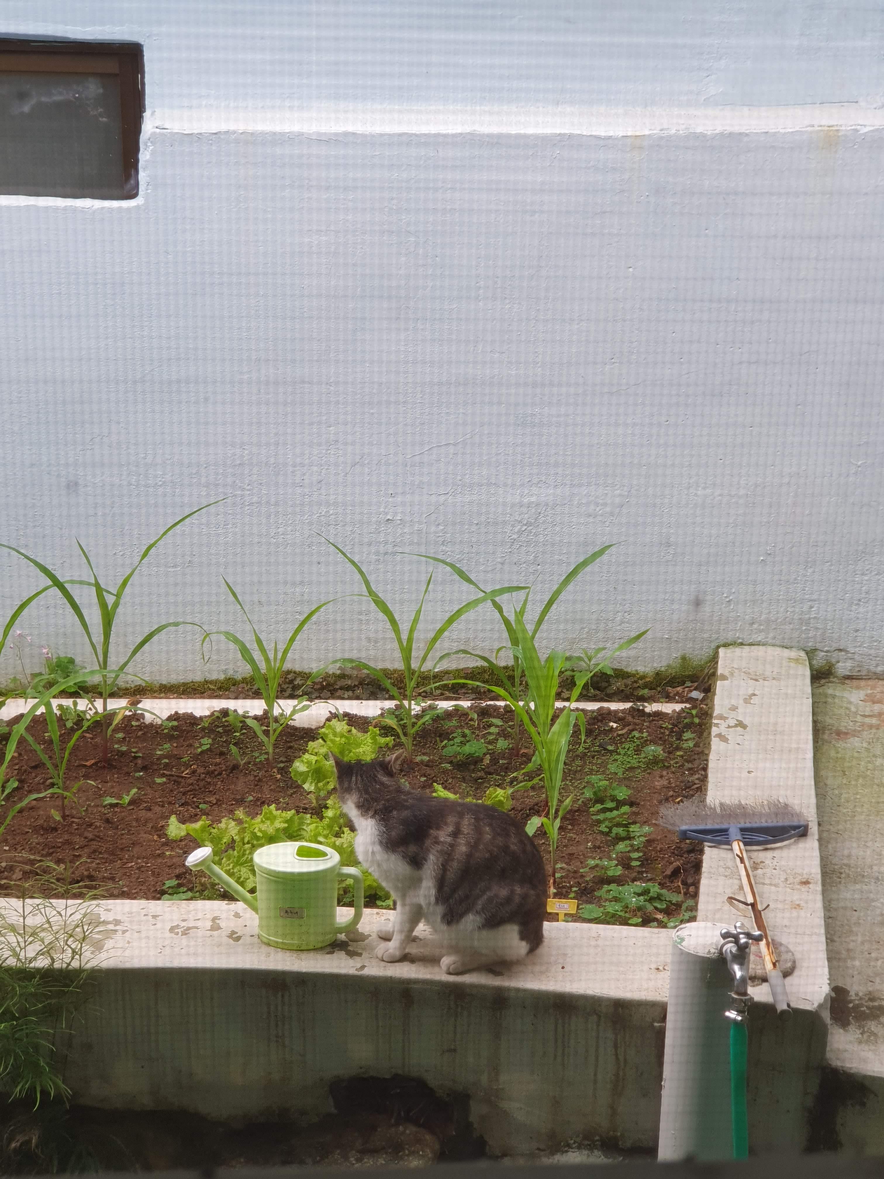 6.8. 토요일에는 옥수수 텃밭을 보며 조기도 구워 보았습니다. 집에 잘 놀러 오는 냥이도 옥수수 멍도 하고, 물도 먹고 가네요 ㅋ