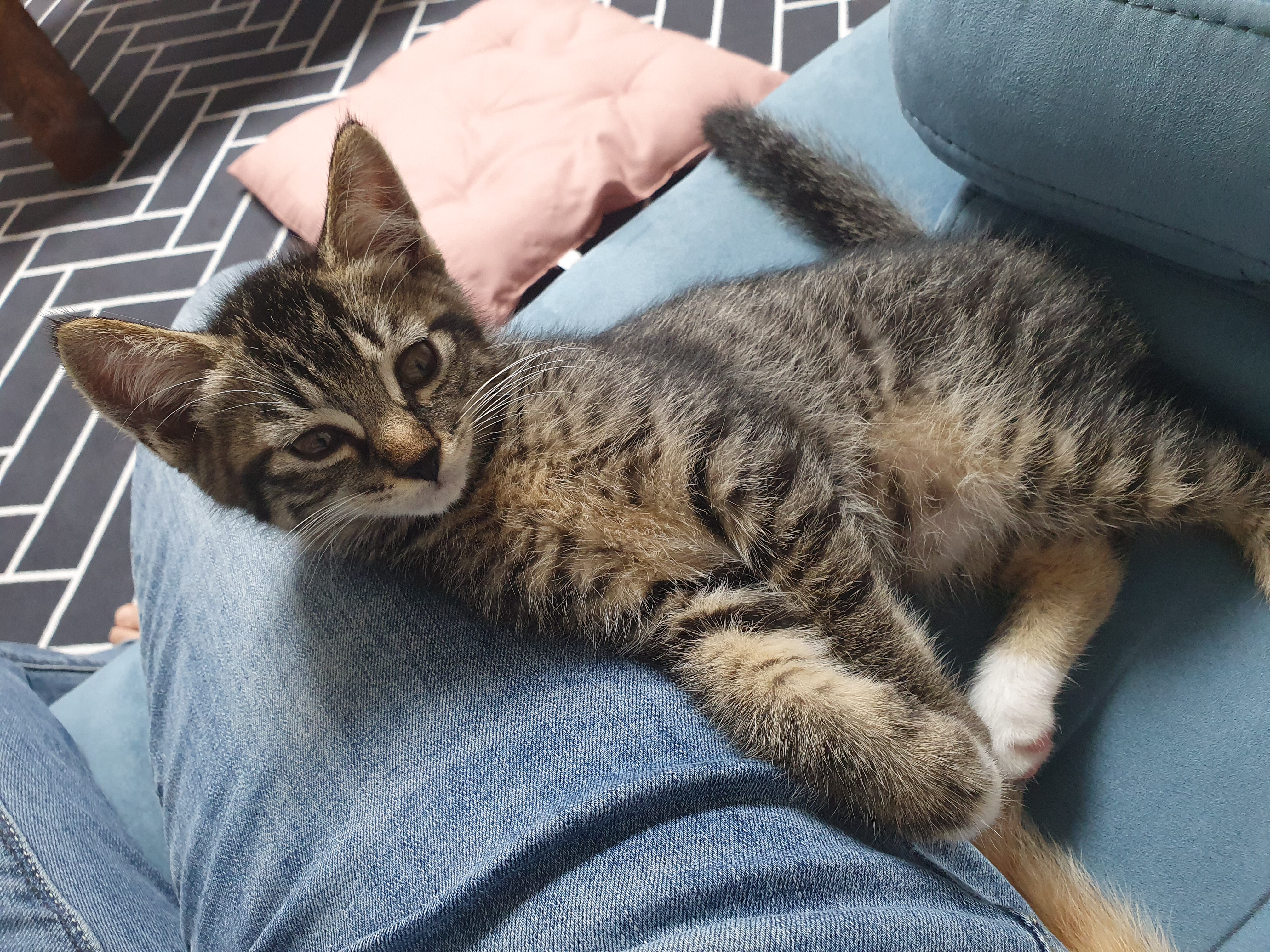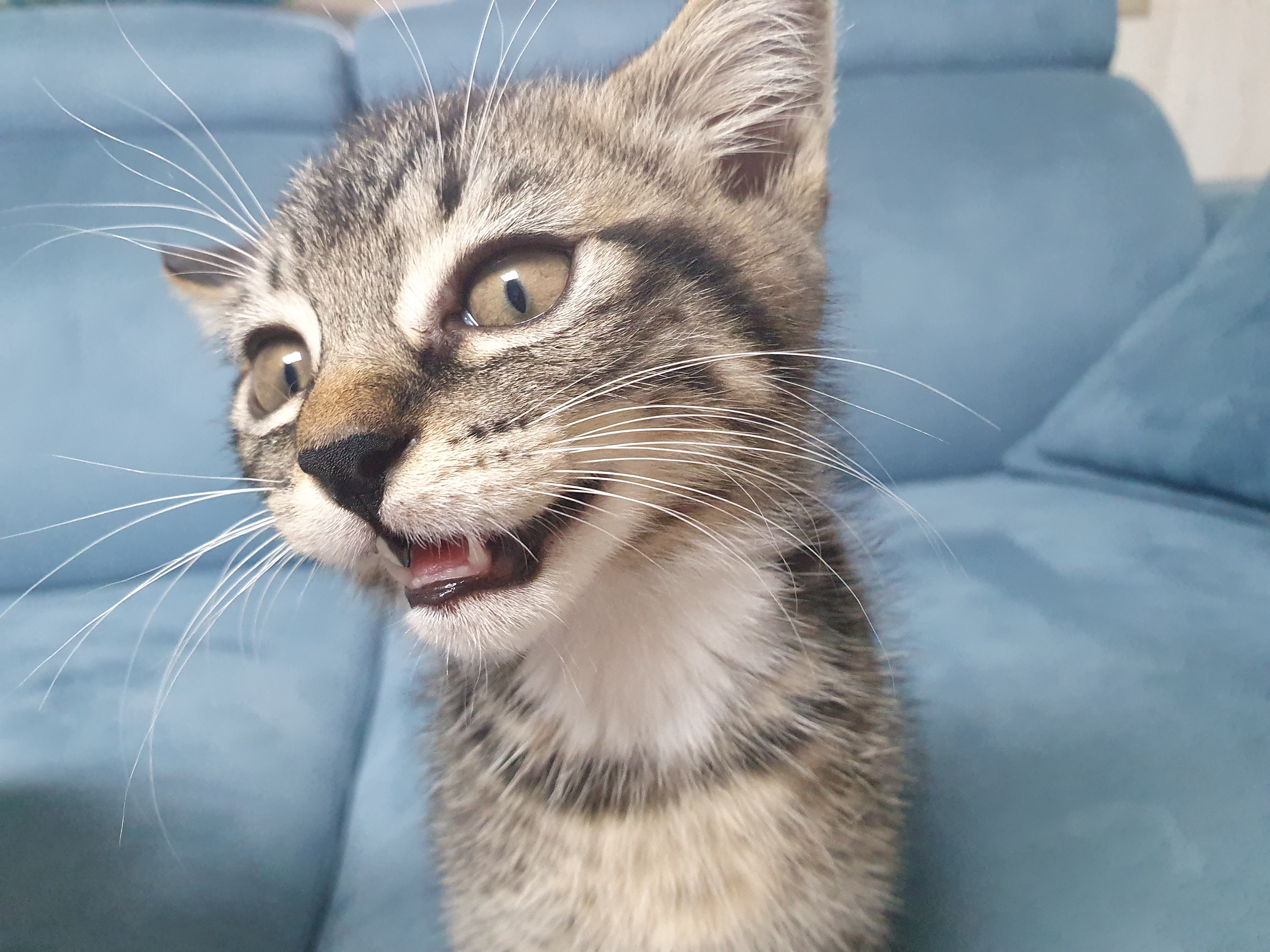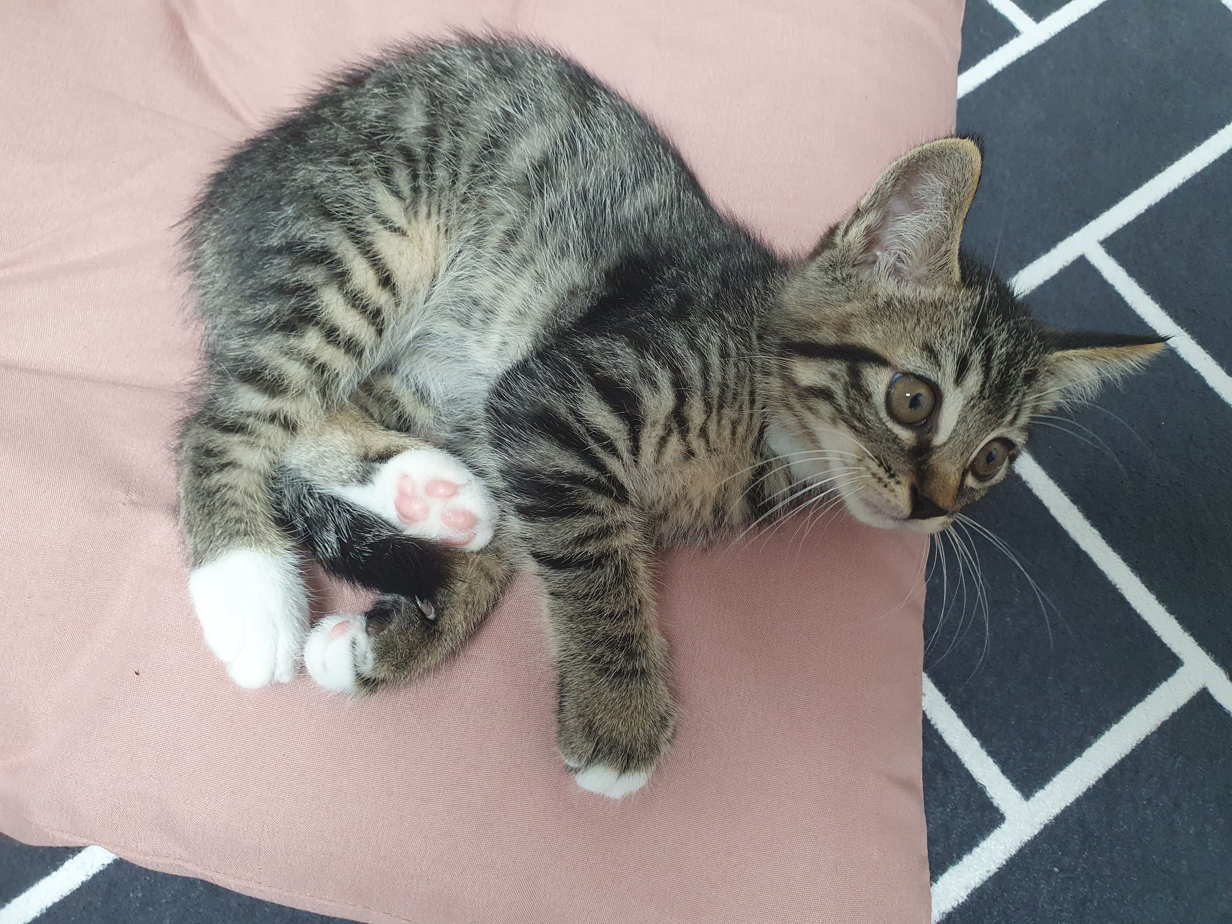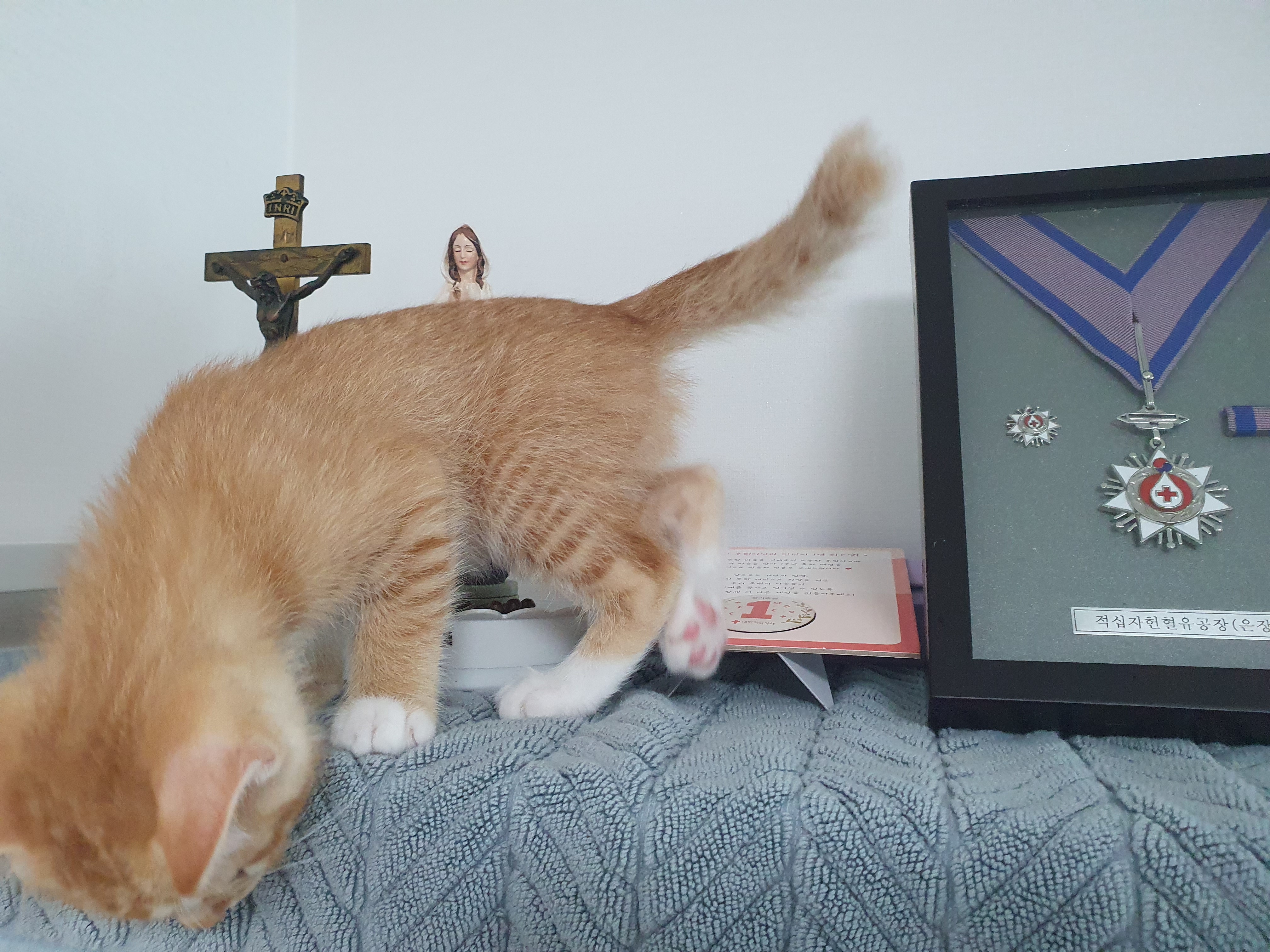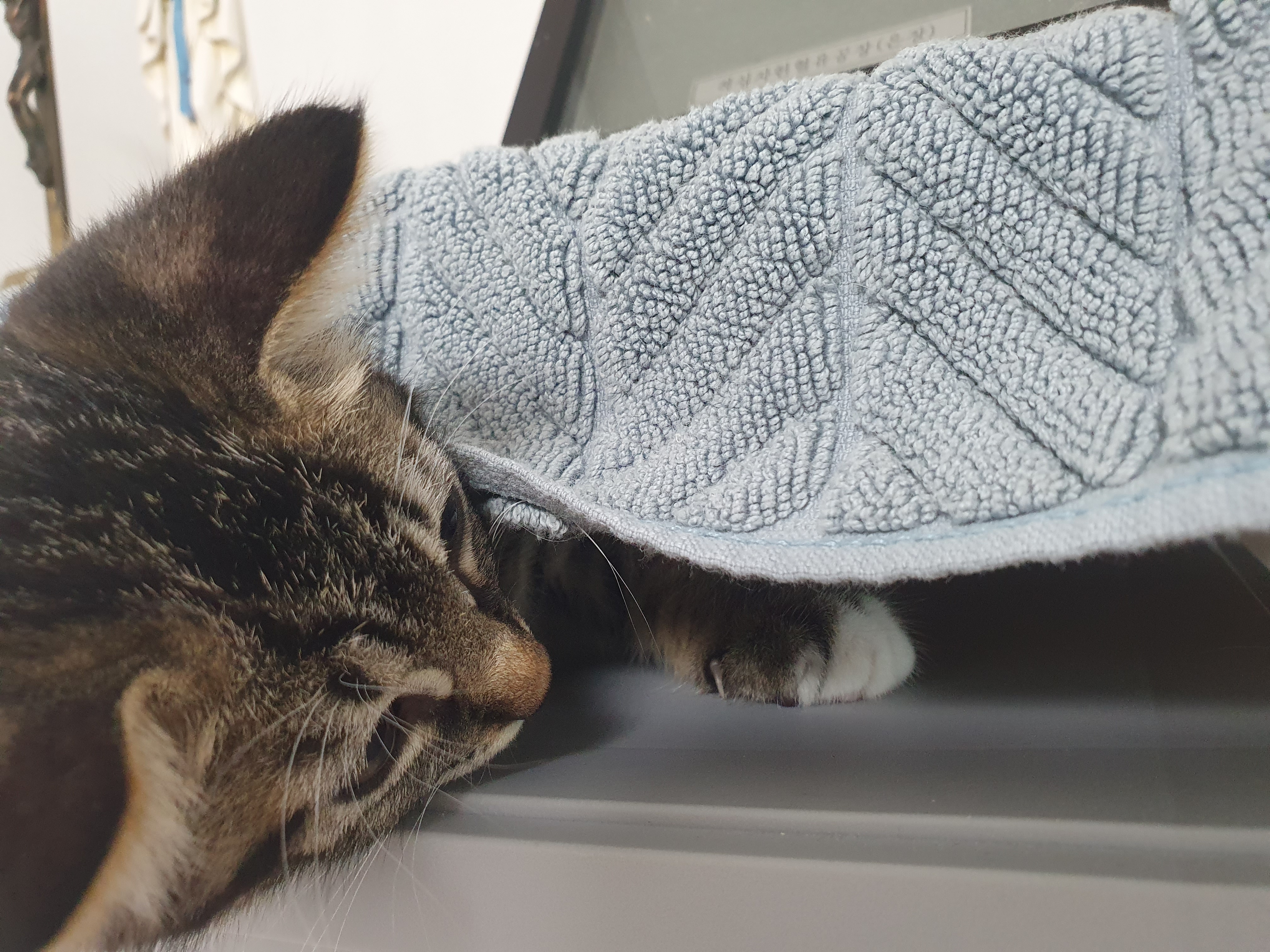 송이는 방석에서 구르밍하다가 새옹이를 봅니다.