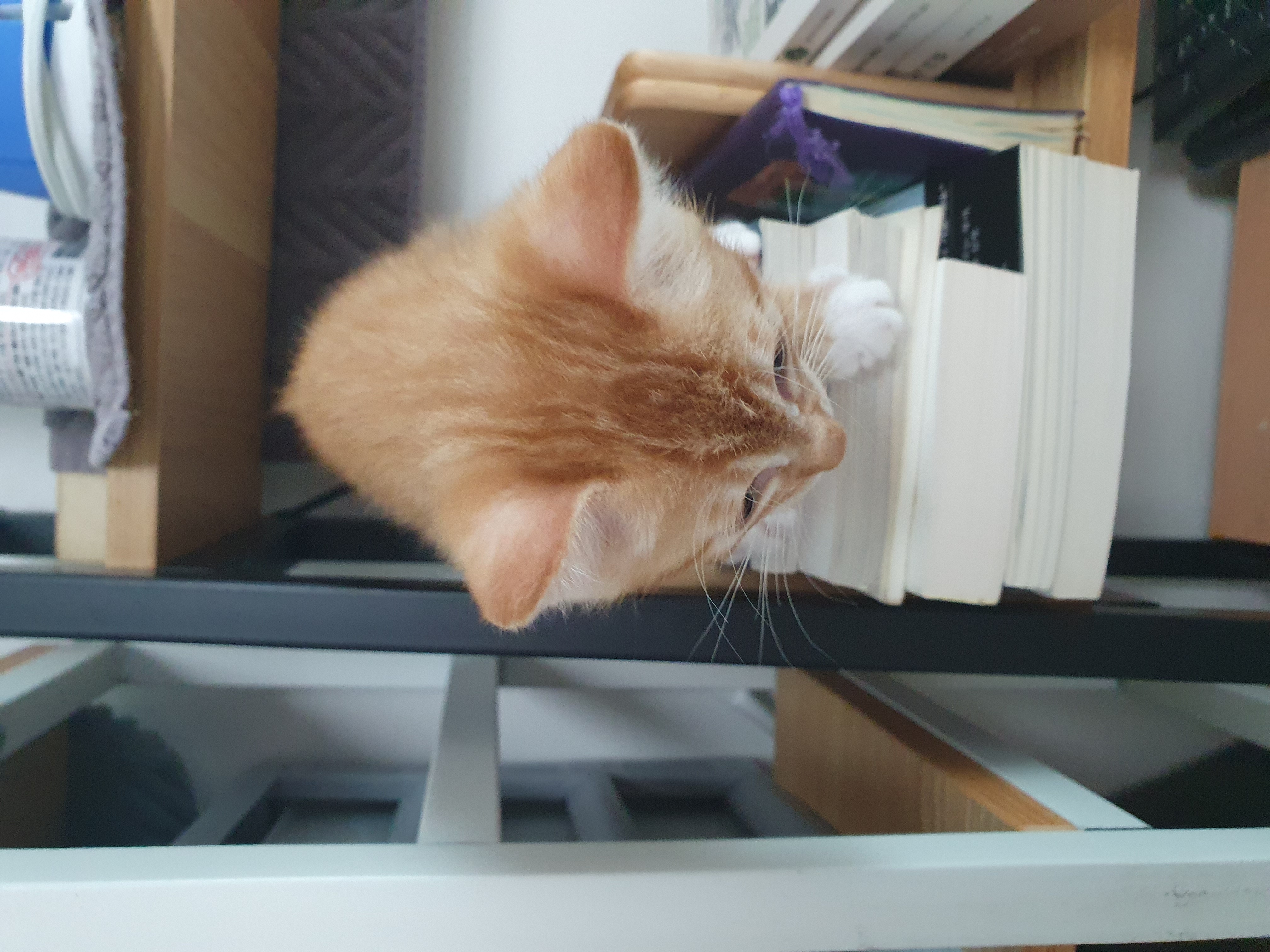 책장 사이 틈을 발견한 송이가 그 밑에 숨자,