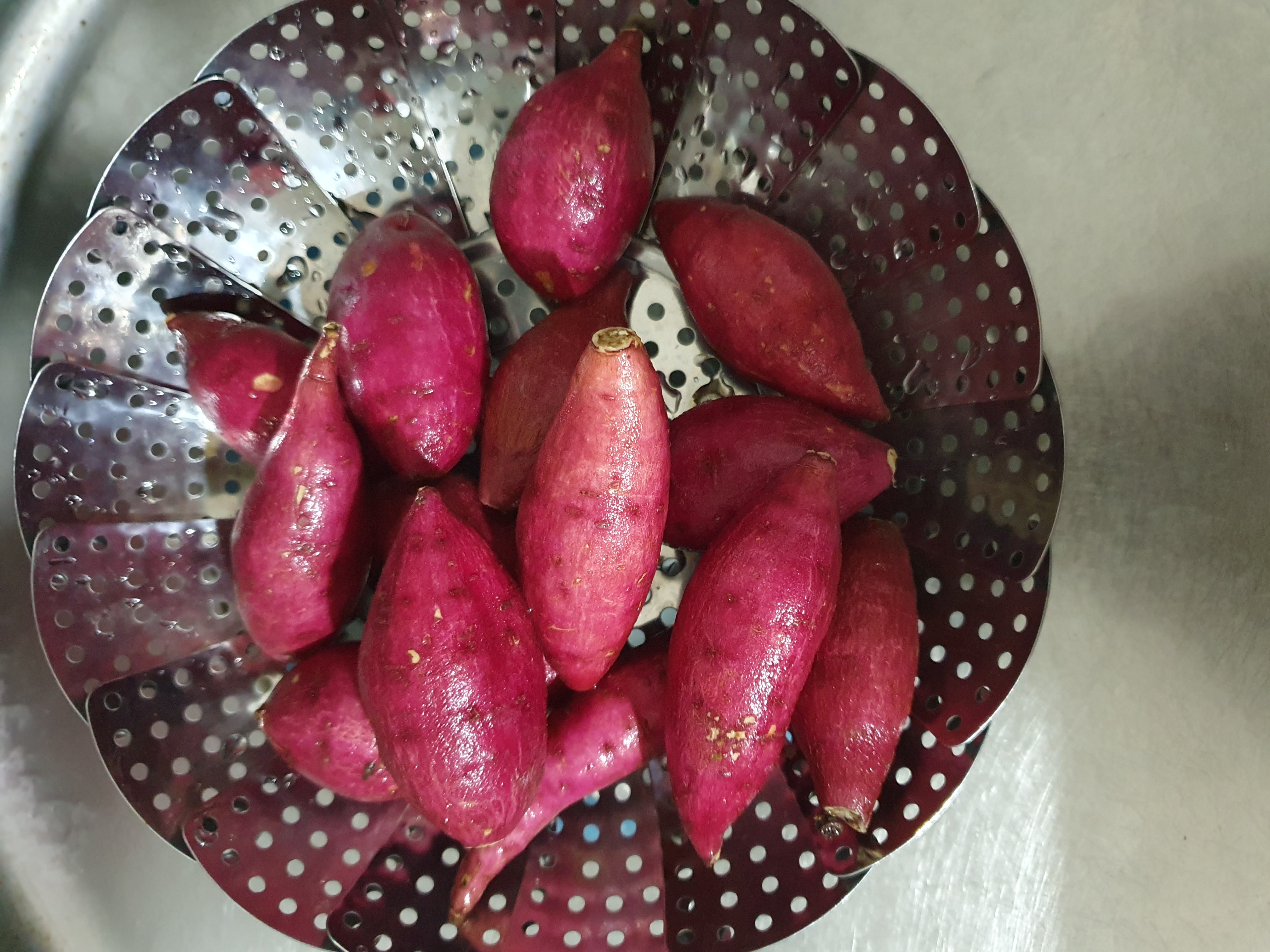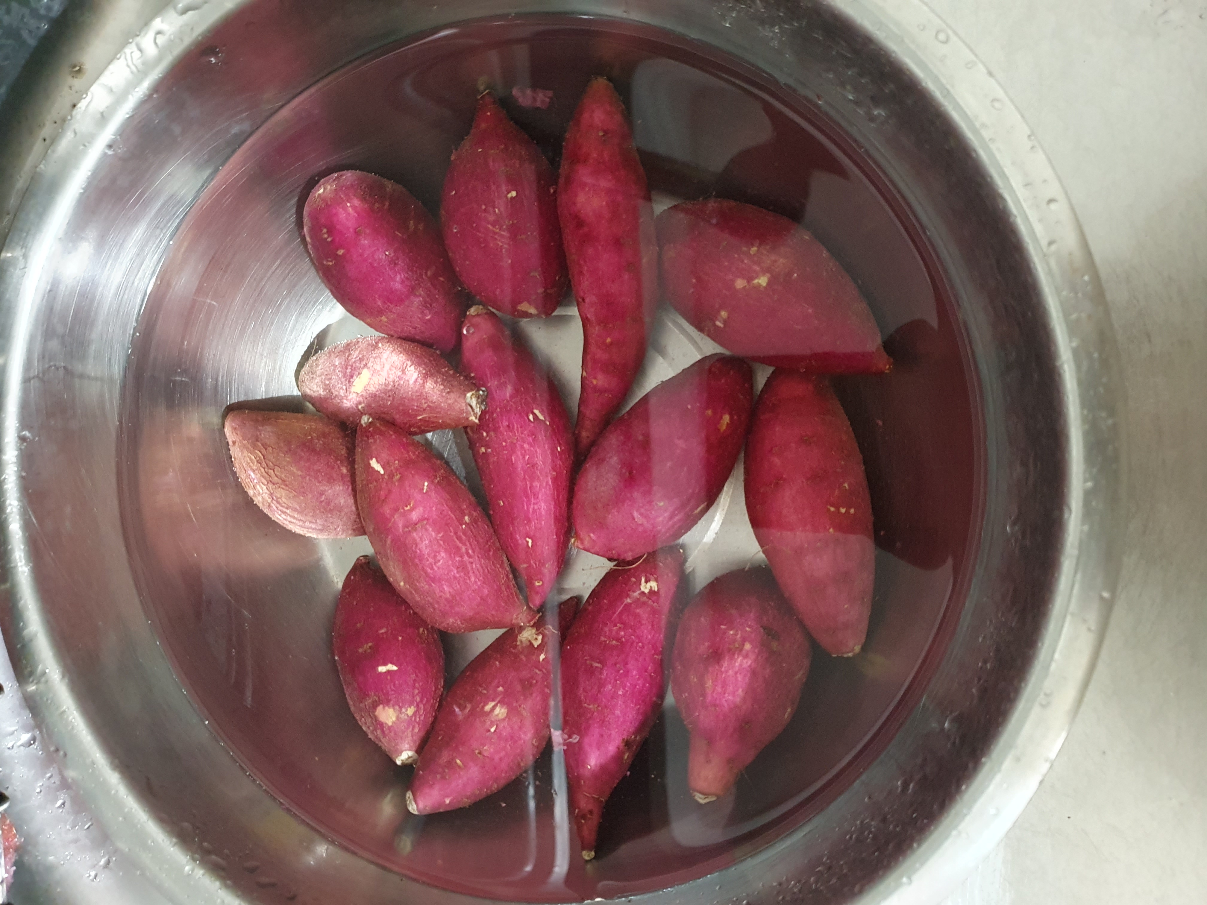 고구마를 물에 담근 다음, 깨끗하게 씻어 줍니다.