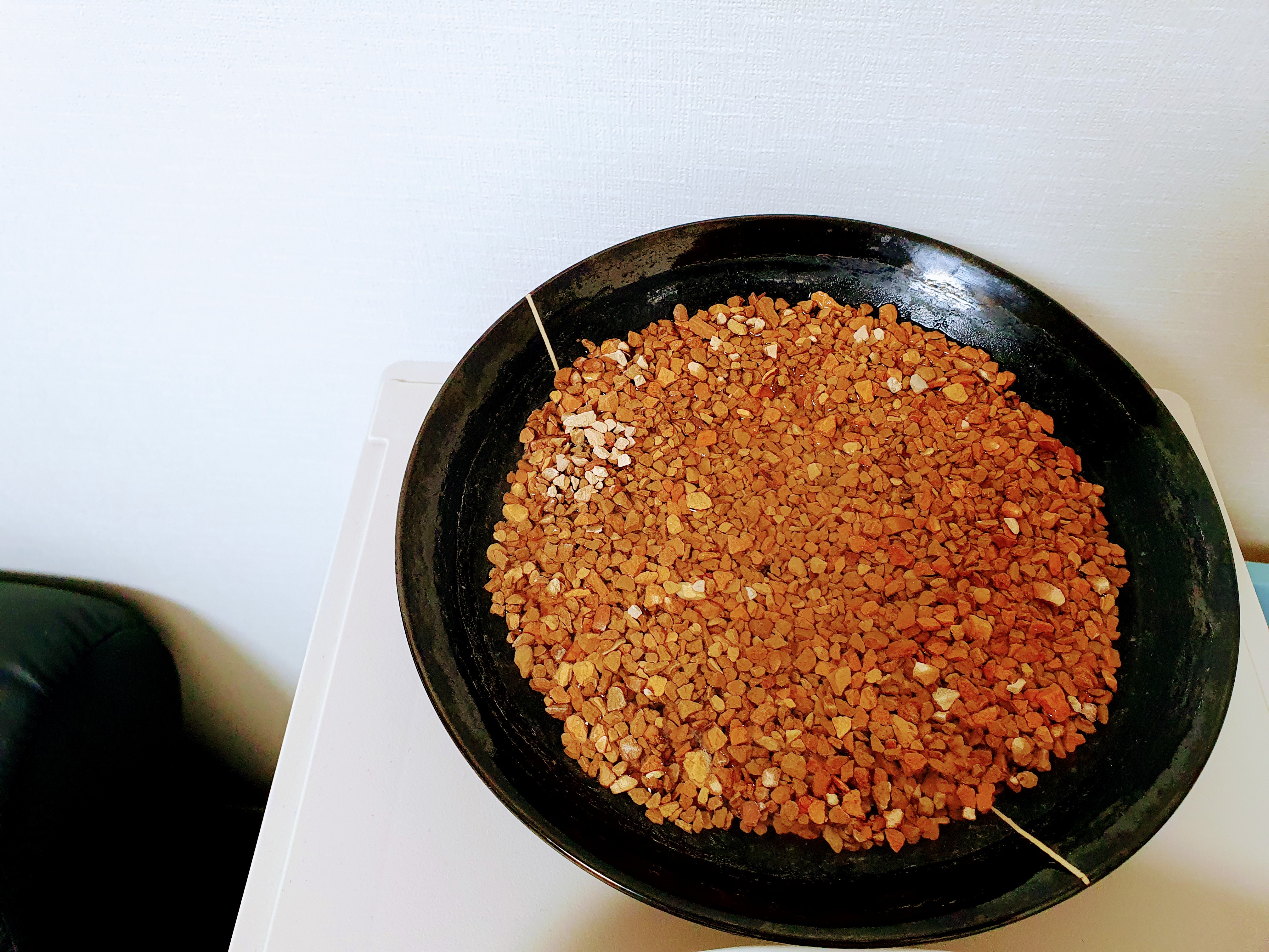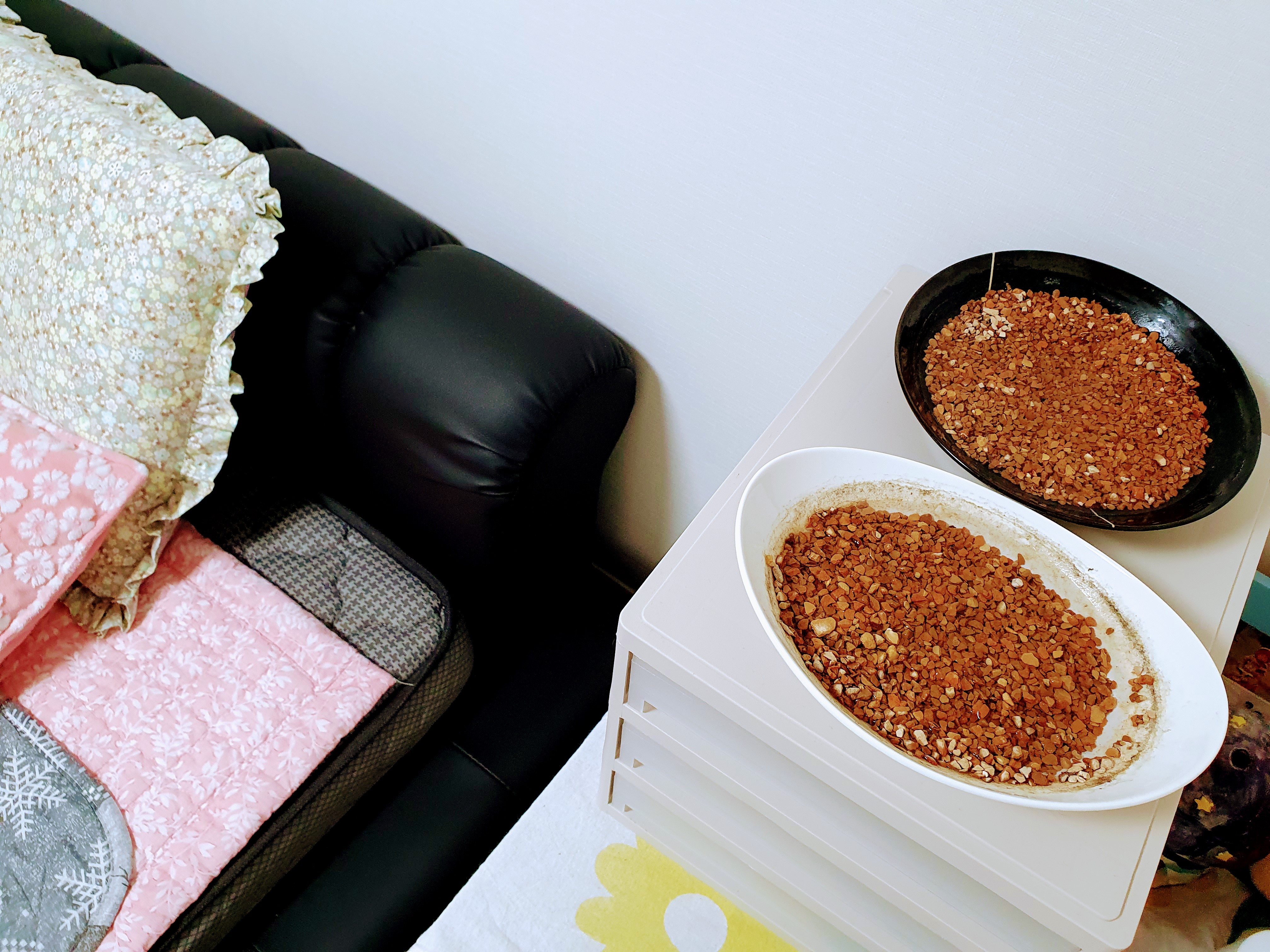 황토돌이 물에 조금 묻힐 정도로만 물을 부어서 침대 머리맡에 놓습니다.