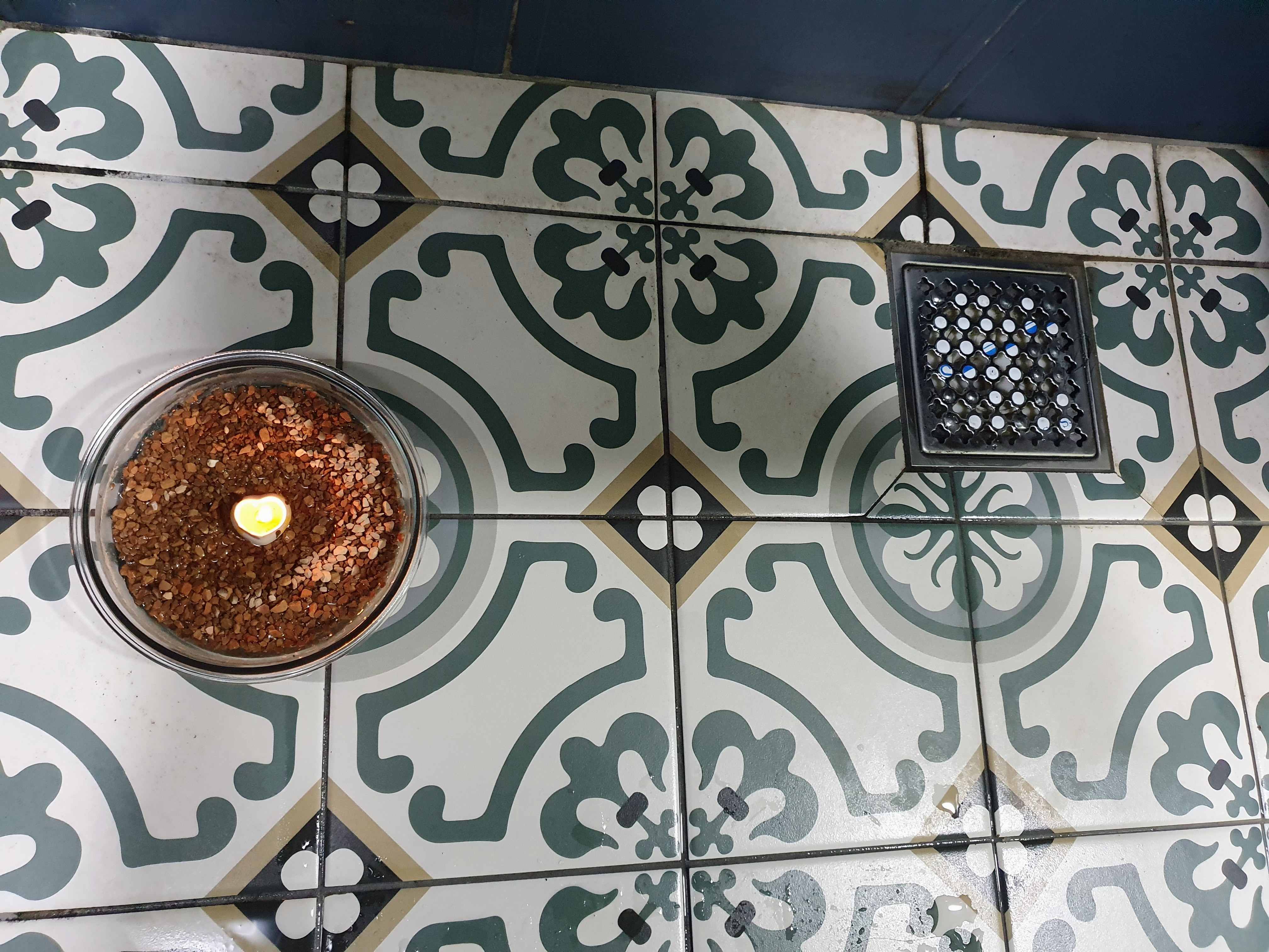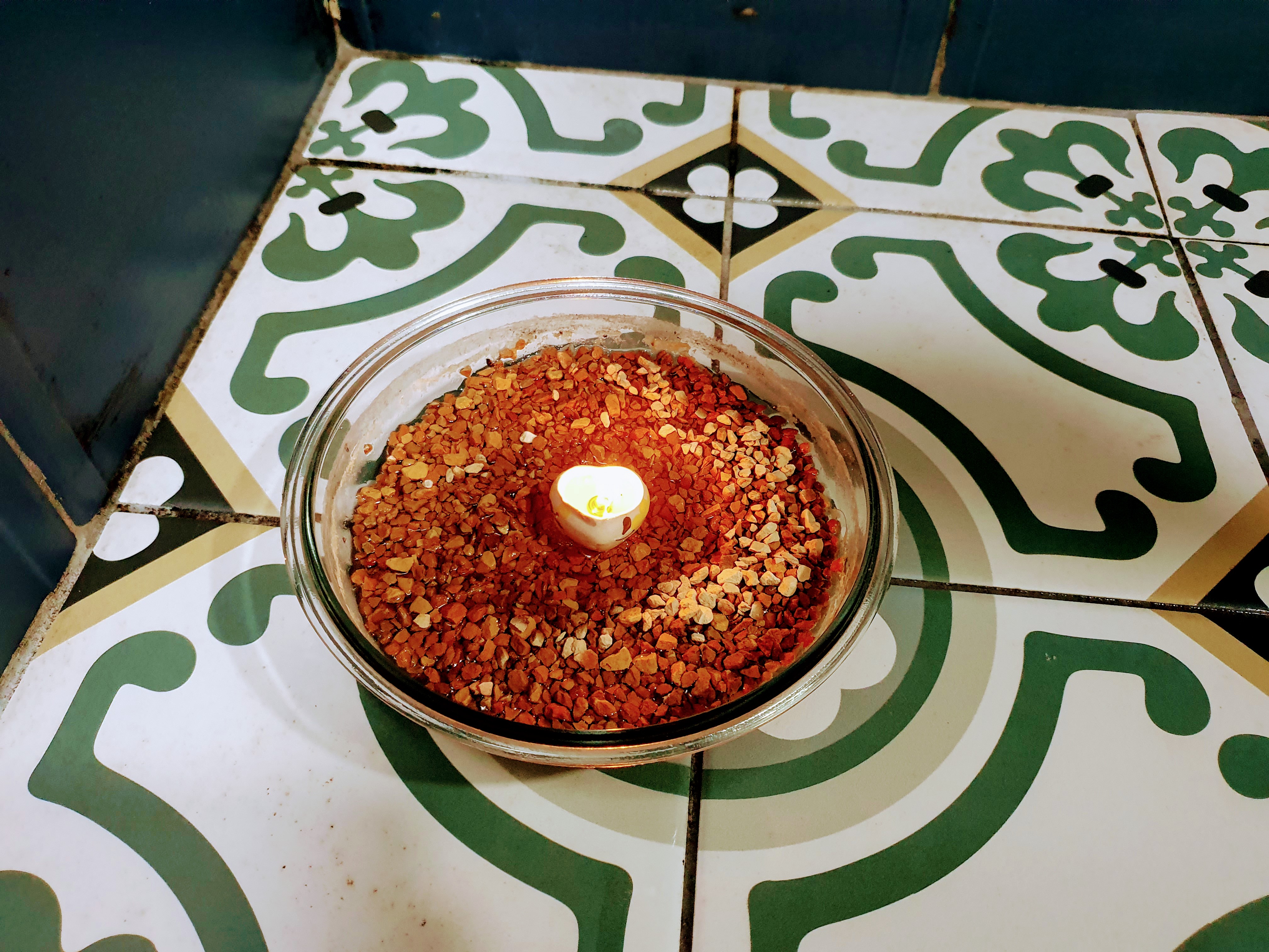 화장실에는 습기도 많지만 냄새도 자주 나기 때문에 여기에도 황토돌을 놓기로 했습니다. 여기에 더 효과를 높이기 위해서 조그만 향초까지 켜 놓았습니다.