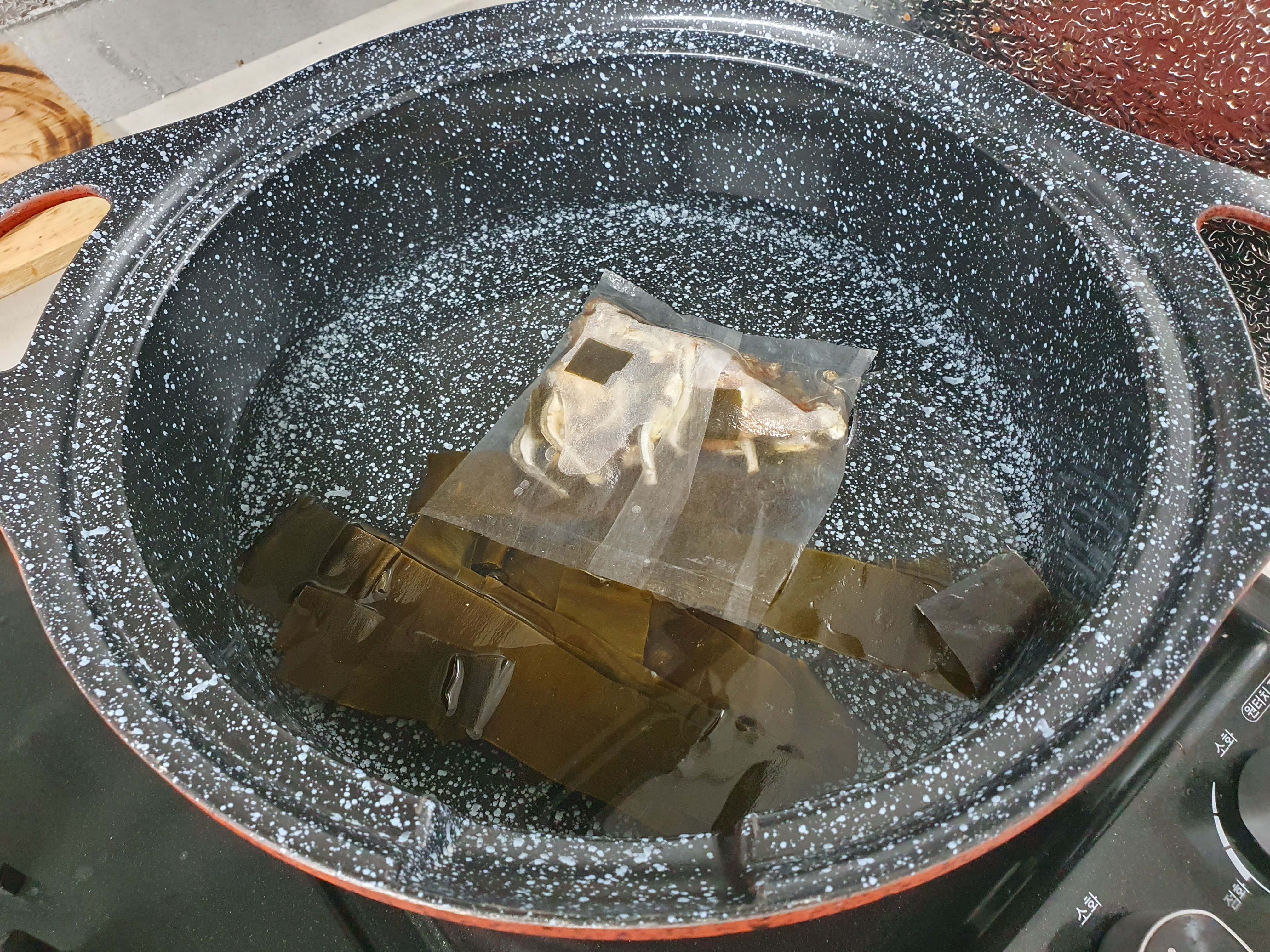 다시다와 육수티벧을 끓여서 육수를 미리 만들어 줍니다.