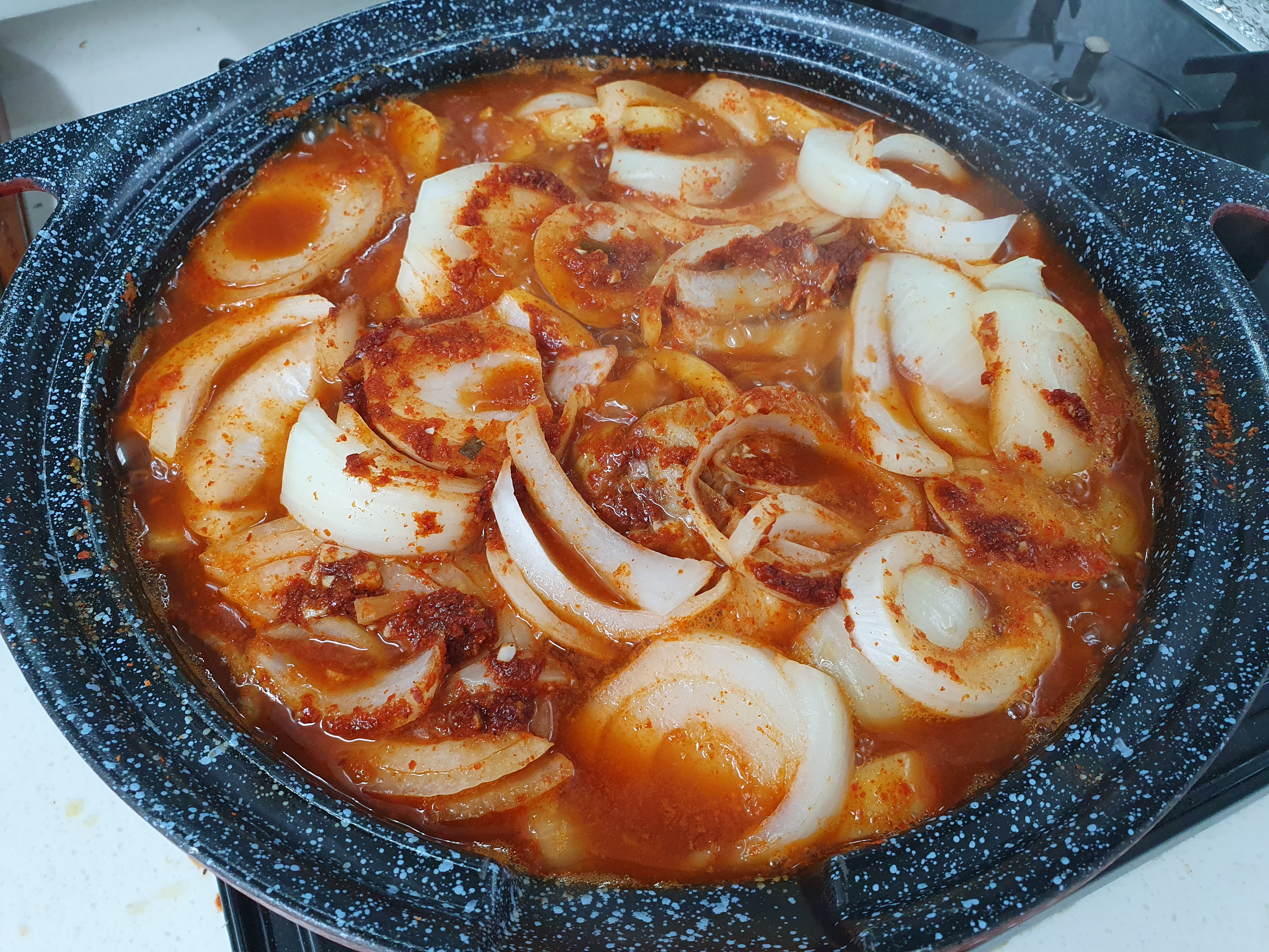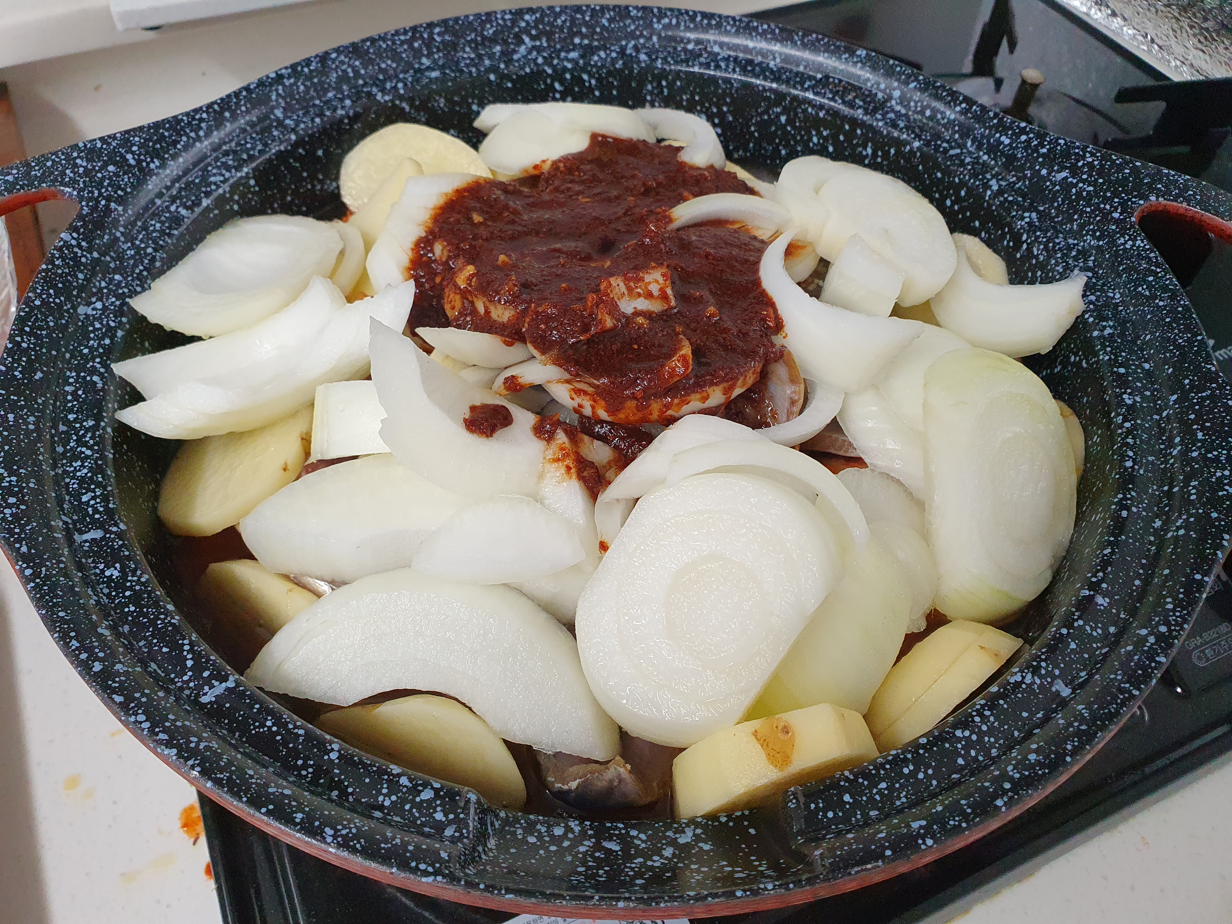 그리고 양파를 그 위에 넣고, 양념장을 가운데에 뿌려 줍니다.