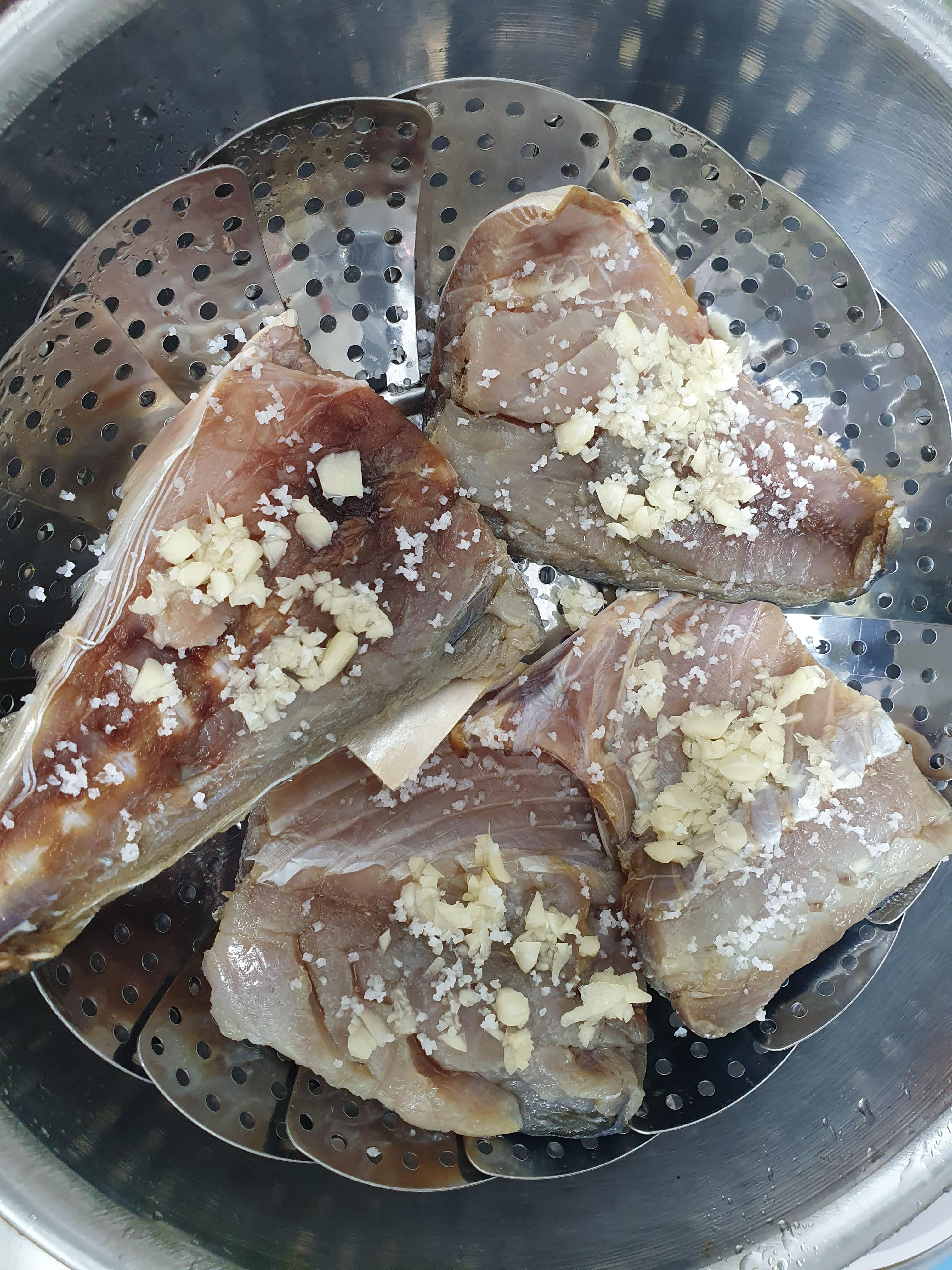 해동된 고등어는 깨끗이 씻어서 마늘과 소금간을 해놓습니다.