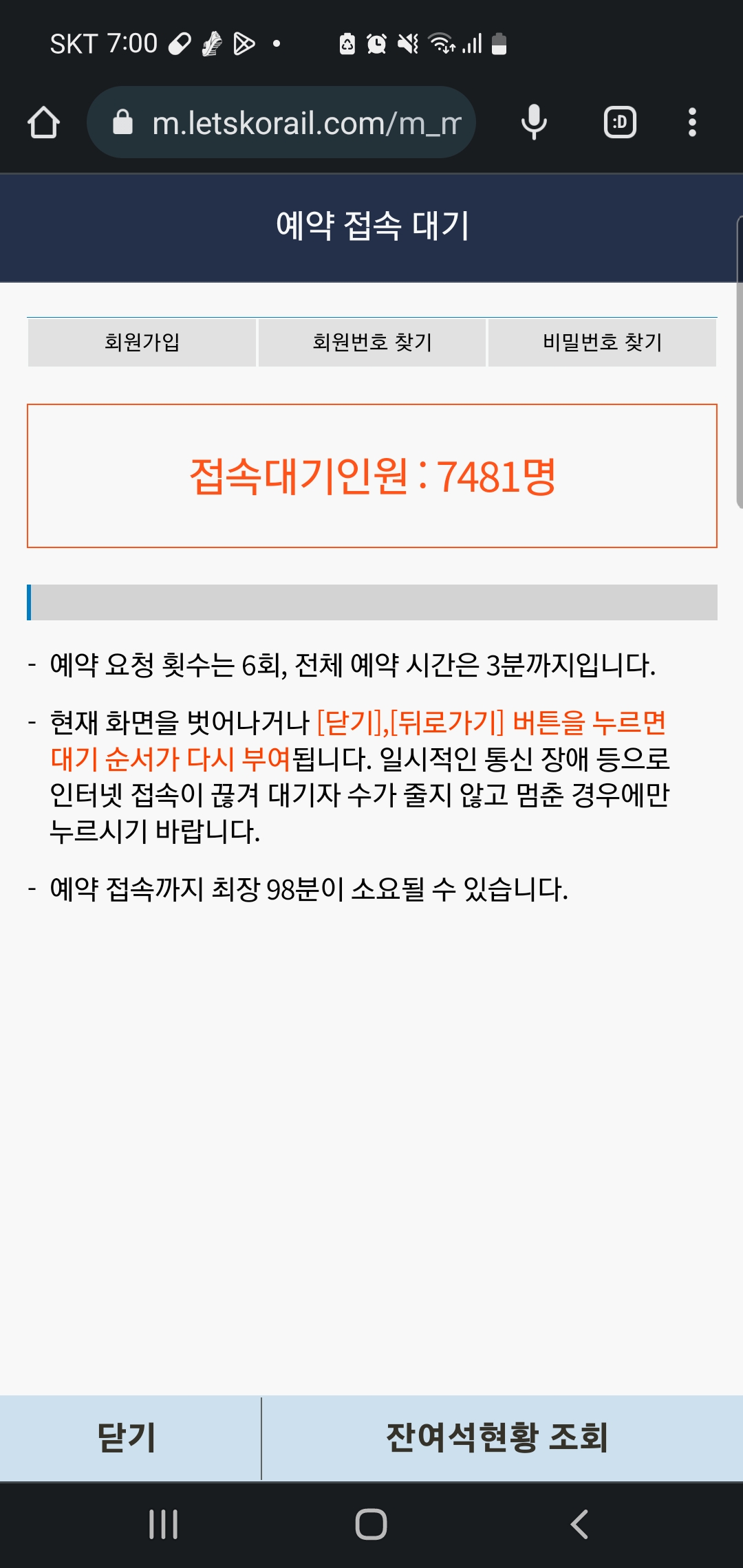ktx로 추석열차예매를 아침 7시부터 시작했습니다. 7시에 바로 들어갔는데도 대기가 7천명 넘게 있네요.